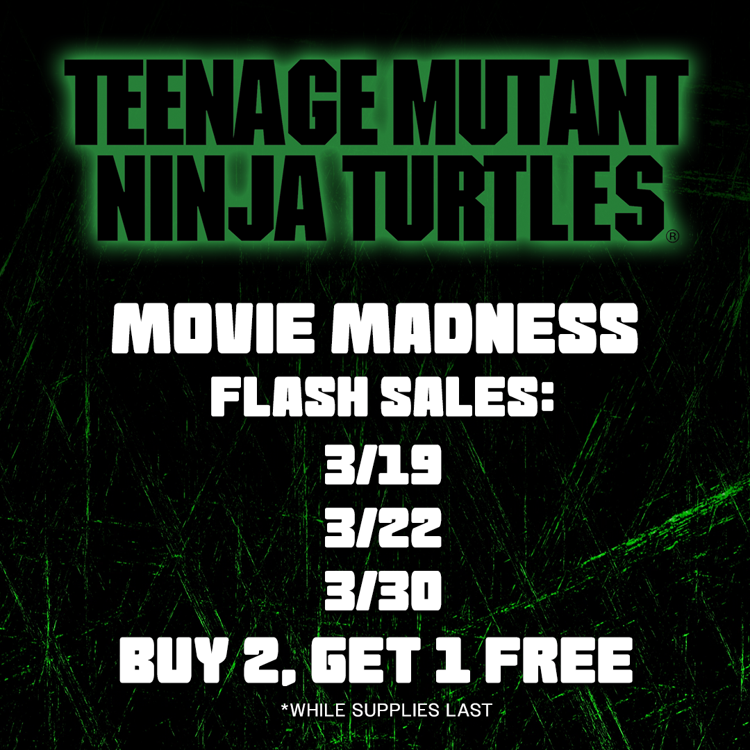 On each special anniversary date for 24 hours only*, you can BUY 2, GET 1 FREE on a rotating selection of fan-favorite figures inspired by the original Turtles trilogy.