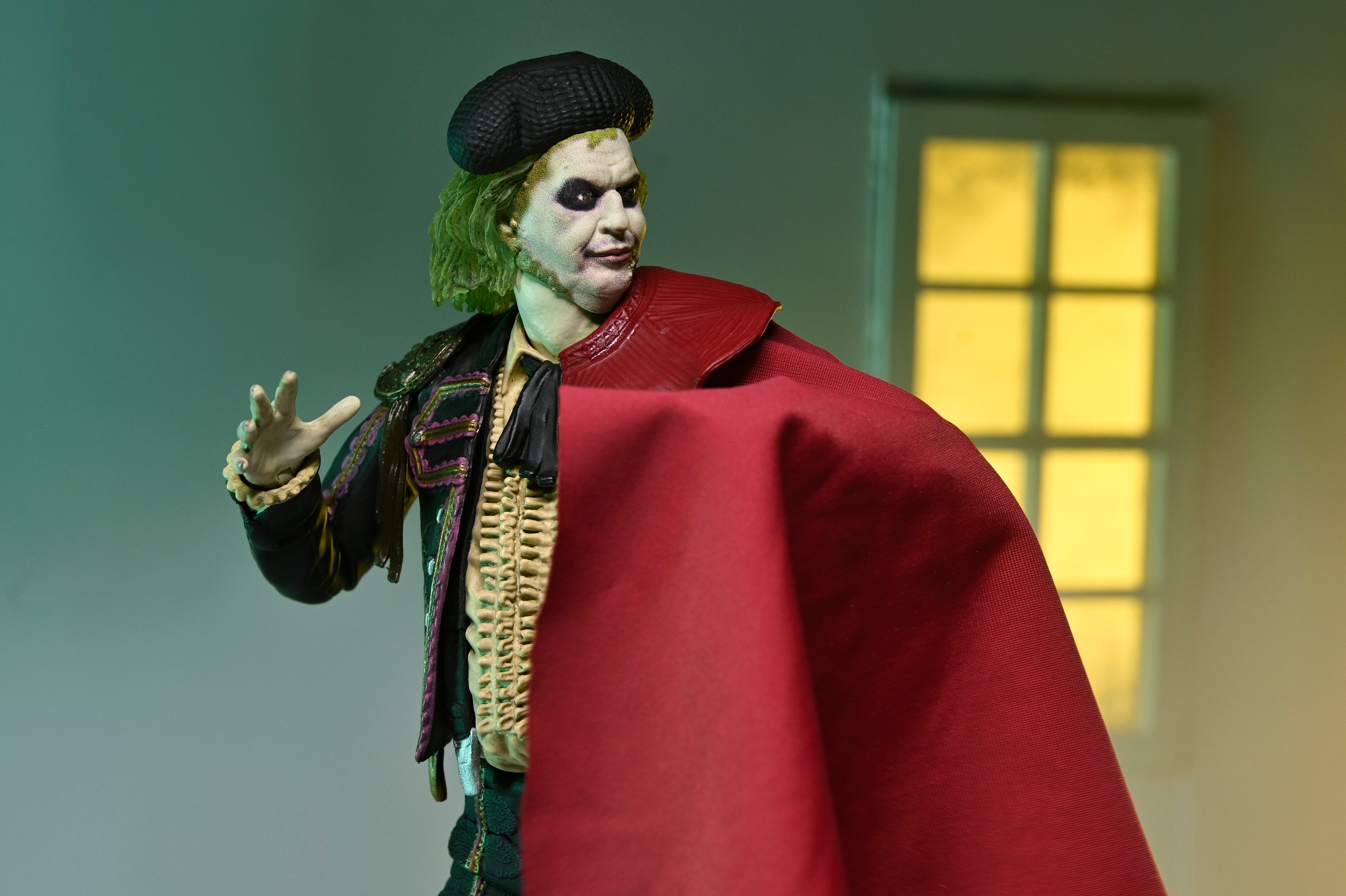 The Ghost with the Most is back! From Tim Burton’s 2024 sequel film, Beetlejuice Beetlejuice, the famous bio-exorcist returns once again to scheme Lydia into marriage so he can finally escape the Afterlife. At the wedding, his nefarious plan is foiled when Lydia's daughter, Astrid, brings a Sandworm into the land of the living to stop him. Beetlejuice quickly transforms into a matador to distract the monstrous Sandworm to swallow his ex-wife instead. NECA brings the chaos of the iconic scene to life with highly detailed Beetlejuice and Sandworm figures in 7-inch scale. Standing over 12 inches tall, the Sandworm is mounted on a church floor base and features articulated jaws, heads, and tongue for dynamic posing. Ultimate Matador Beetlejuice comes with a cloth cape and interchangeable hands and faceplates. This 2-pack comes in window box packaging perfect for display in your NECA Beetlejuice collection!
